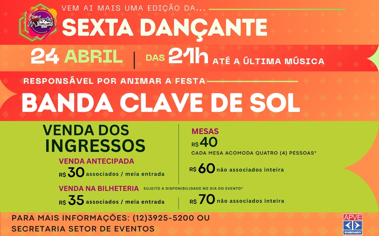 A tradicional Sexta Dançante de Abril será realizada no dia 24 de abril, com apresentação da Banda Clave de Sol, diretamente do Rio de Janeiro.